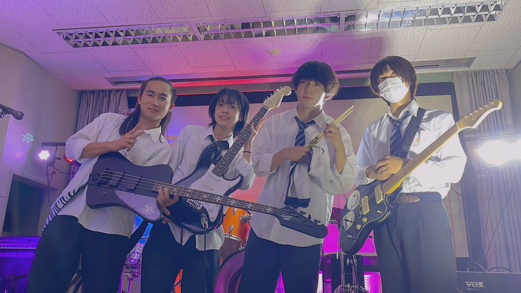 | ☆学生[初] 【バンド名】niho niho 【メンバー名】Vo:えんどうはるき、Gt:わたなべかいと、Ba:よねだりゅうじ、Dr:のしたしゅうご 【人数】4人 【ジャンル】コピー 【バンドPR】本番に弱いので温かい目でみてください。 【宣伝したいこと】なし (インタビュー 2022/10/23) | |