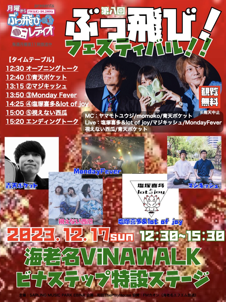 LIVE:①青天ポケット/②マジキッシュ/③Monday Fever/④塩塚喜多&lot of joy/⑤視えない西瓜