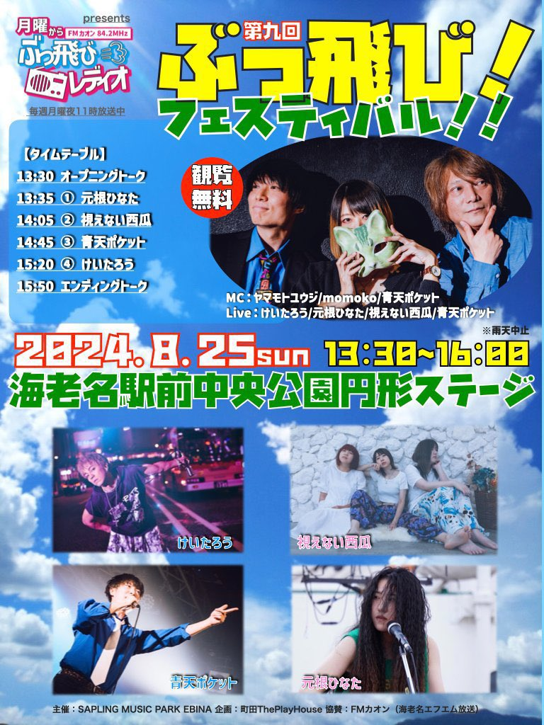 ■出 演 「月曜からぶっ飛びレディオ」パーソナリティ ヤマモトユウジ(ThePlayHouse)/momoko(視えない西瓜)/ひろあき(青天ポケット)