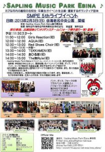 007th Live Circle EBINA ARTIST 開催日:2013年04月29日 / 最終更新日時 : 2018年1月27日 SMPE 7th Live Circle EBINA ARTIST ☆海老名高校有志バンド 在校生 【バンド名】Rock of Rock(初出演) 【メンバー名】6名 【人数】Vo:小菅涼平,Gt:川口諒馬,Gt2:大川裕己, B […] 続きを読む