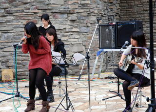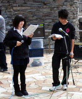 | 2バンド目は、間引きです。中央農業高校軽音楽部の1年生の初ライブとなります。普段の練習成果の披露です。緊張していますが、先輩方の司会で解きほぐしています。 |