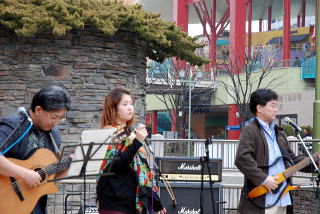 | 安定した演奏で、お客さんもそれなりに集まり、3人の連携もうまくいき、ノリノリで対応してくれています。 |