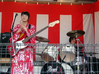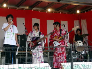 | お客さんも、ステージ前に集まりだして、耳を傾けていただきました。手拍子も頂きありがとうございます。 |