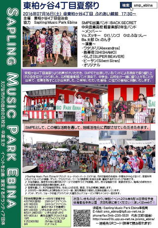 2017年9月30日/ 最終更新日時 : 2026年1月6日 SMPE市内お祭り 東柏ヶ谷4丁目夏祭り2016東柏ヶ谷4丁目夏祭り2016 ■日時:2016年7月16日(土) ■参加団体:1 ■参加人数:200人(お祭り) ■天候:晴れFacebookXBlueskyHatenaCopy